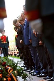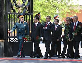 Торжественные мероприятия, посвященные 65-летнему юбилею Победы в Великой Отечественной войне. Слева направо: президент Вьетнама Минь Чиет Нгуен, председатель КНР Ху Цзиньтао, президент России Дмитрий Медведев, федеральный канцлер Германии Ангела Меркель, президент Казахстана Нурсултан Назарбаев, президент Таджикистана Эмомали Рахмон и президент Израиля Шимон Перес во время церемонии возложения цветов к мемориалу "Могила Неизвестного Солдата" в Александровском саду.