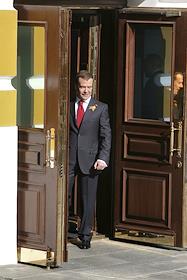 Президент России Дмитрий Медведев во время церемонии встречи глав иностранных государств, правительств, международных организаций и почетных гостей в Кремль перед началом парада, посвященного 65-летию Победы в Великой Отечественной войне.