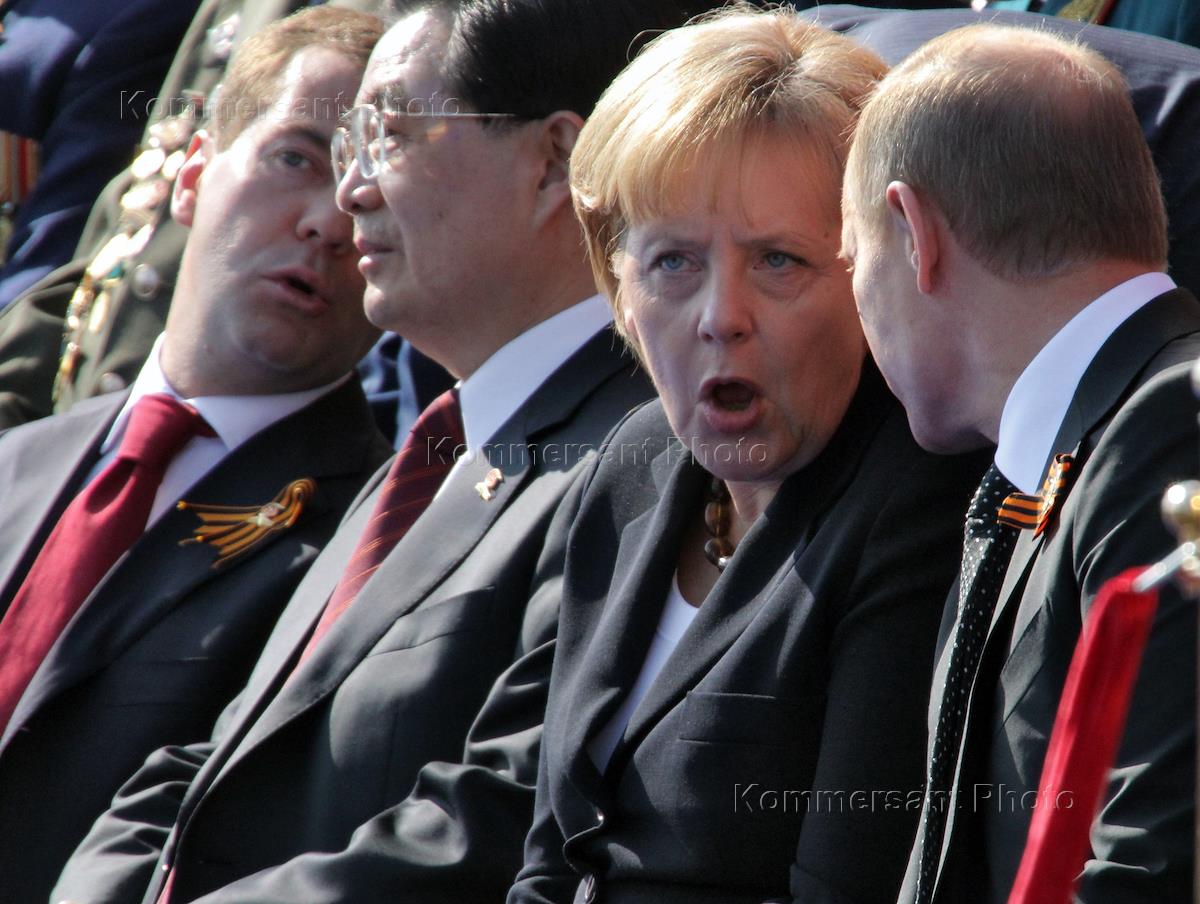 Слева направо: президент России Дмитрий Медведев, председатель КНР Ху Цзиньтао, канцлер Германии Ангела Меркель и председатель правительства России Владимир Путин на военном параде, посвященном 65-й годовщине победы в Великой Отечественной войне. Парад прошел на Красной площади.