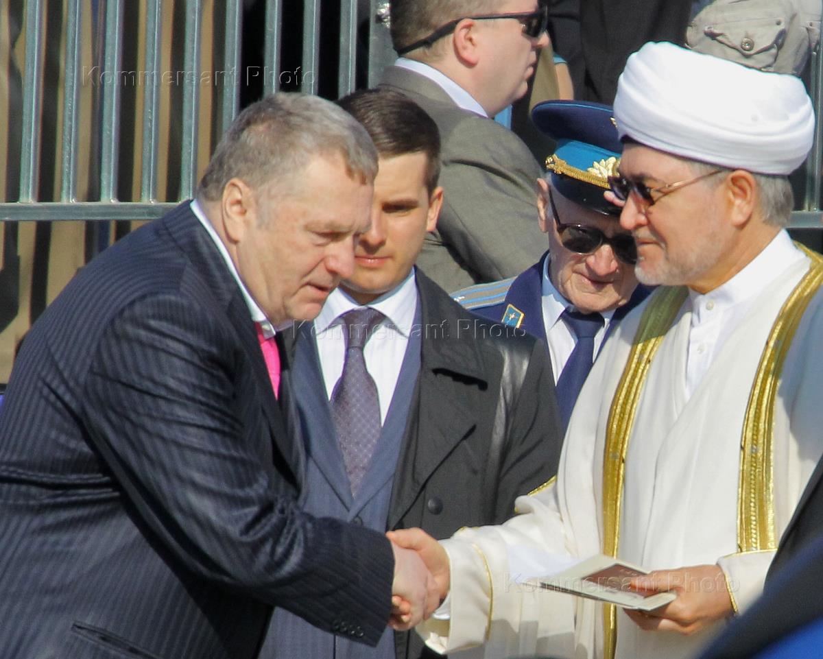 Лидер Либерально-демократической партии России (ЛДПР), заместитель председателя Государственной думы России Владимир Жириновский (слева) и муфтий шейх, председатель Духовного управления мусульман европейской части России Равиль Гайнутдин (в центре) перед началом Парада Победы, приуроченного к 65-летию победы в Великой Отечественной войне. Парад прошел на Красной площади.