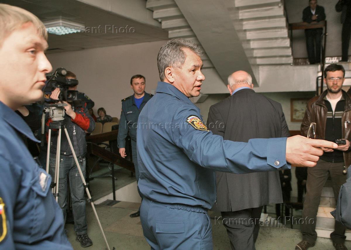 Russian Emergencies Minister Sergey Shoigu (center) during a rescue operation at the site of the explosion in the Raspadskaya mine in Mezhdurechensk, Kemerovo Region.