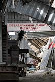 Спасательная операция на месте взрыва в шахте "Распадская" в городе Междуреченск Кемеровской области. Плакат "Безаварийной работы Распадцы!".