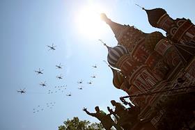 Истребители пилотажных групп "Русские витязи" и "Стрижи", образовавших в воздухе цифру 65, и вертолеты Ми-28 во время Парада Победы, приуроченного к 65-летию победы в Великой Отечественной войне. Парад прошел на Красной площади.
