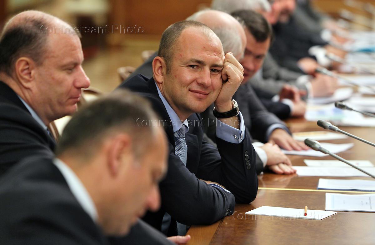 Председатель совета директоров АФК "Система" Владимир Евтушенков (слева) и заместитель председателя правительства России Игорь Сечин (справа) на встрече председателя правительства России Владимира Путина с представителями Российского союза промышленников и предпринимателей (РСПП).