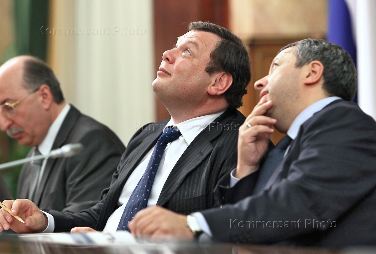 Chairman of the Supervisory Board of the consortium of Alfa Group Mikhail Fridman (in the center) and president of the group ONEXIM Mikhail Prokhorov (right) at a meeting of the russian Prime Minister Vladimir Putin with representatives of the Russian Union of Industrialists and Entrepreneurs.