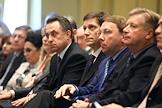 Слева направо: вновь избранный президент олимпийского комитета России Александр Жуков, президент Федерации спортивной борьбы России Михаил Мамиашвили и управляющий делами президента России Владимир Кожин на собрании олимпийского комитета по избранию президента олимпийского комитета.