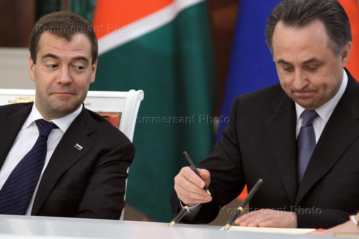 Президент России Дмитрий Медведев (слева) и министр спорта, туризма и молодежной политики России Виталий Мутко (справа) во время переговоров с президентом Намибии Хификепунье Похамба. Переговоры прошли в Кремле.