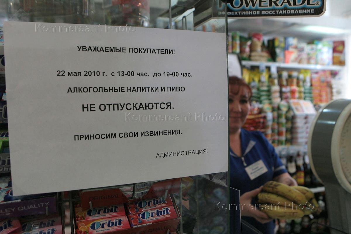 Запрет на торговлю алкоголем в Междуреченске. Объявление в магазине "Уважаемые покупатели! 22 мая 2010 г. с 13-00 до 19-00 час. Алкогольные напитки и пиво не отпускаются. Приносим свои извинения. Администрация".