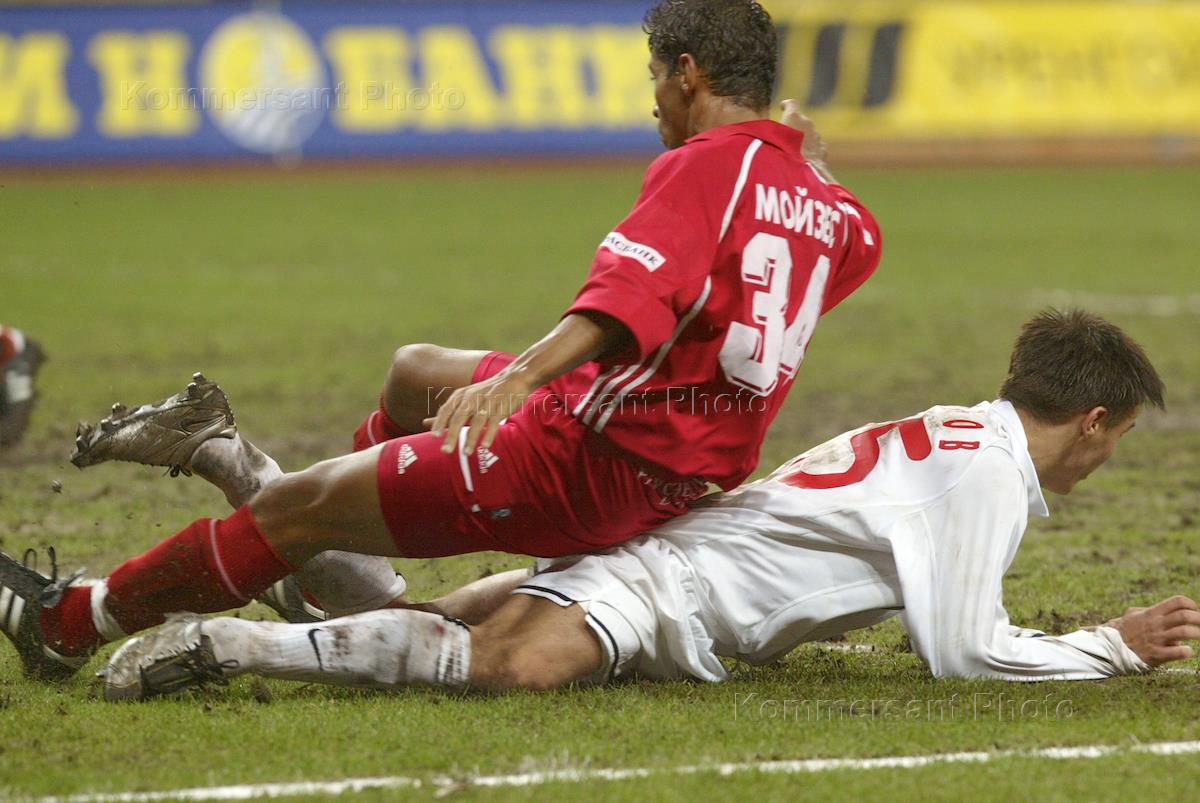 Players of the Moscow football clubs Lokomotiv (white tunics) and Spartak (red tunics) fight for the ball.