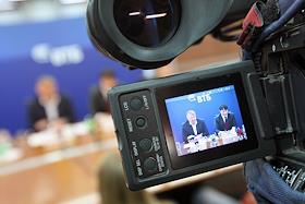 Пресс-брифинг первого заместителя президента - председателя правления ВТБ Василия Титова (на экране слева), посвященный запуску льготных продуктов.