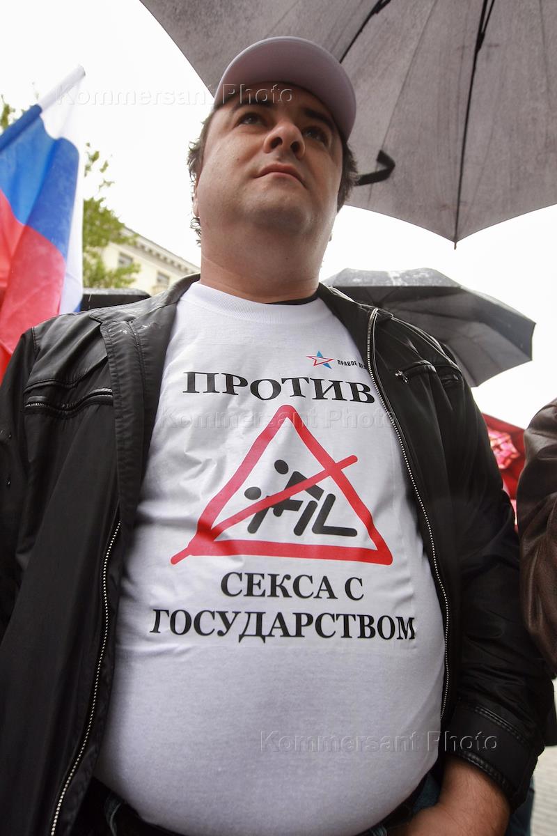 Член партии "Правое дело", руководитель центра социальных технологий Андрей Богданов на митинге предпринимателей. Митинг, организованный партией "Правое дело" прошел у памятника Александру Грибоедову на Чистопрудном бульваре. Надпись на футболке: "Против секса с государством".