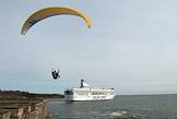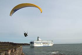 Жанровая фотография. Морской паром Silja Line. Человек летит на параплане над морем.