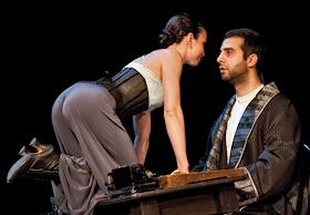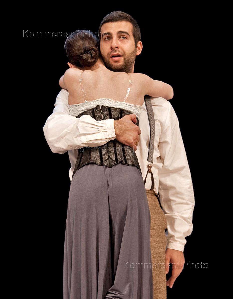 Актеры Александра Урсуляк и Иван Ургант в спектакле "Бешеные деньги" по комедии А.Н.Островского в постановке режиссера Романа Козака на сцене Московского драматического театра имени А.С.Пушкина.