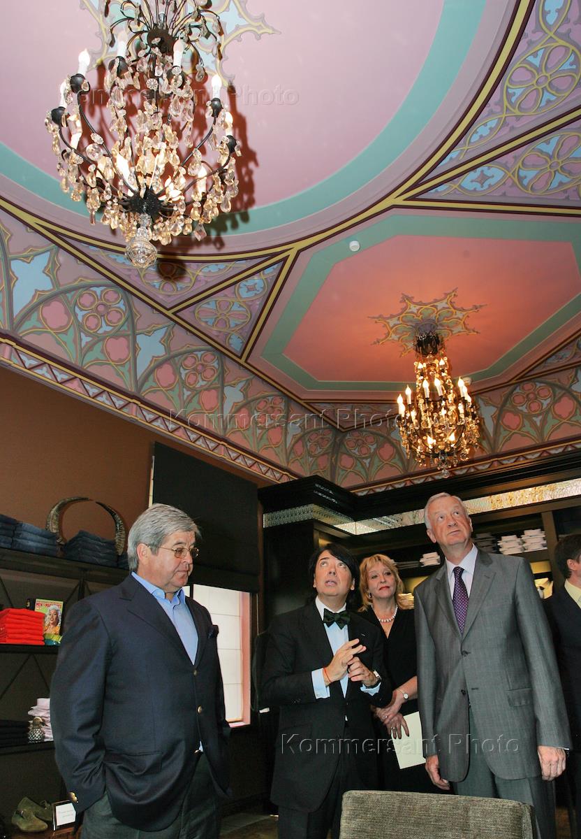 Модельер Валентин Юдашкин (второй слева) и руководитель аппарата правительства Москвы Виктор Коробченко (справа) на коктейле по случаю открытия флагманского представительства Дома моды Valentin Yudashkin в Вознесенском переулке.