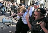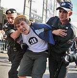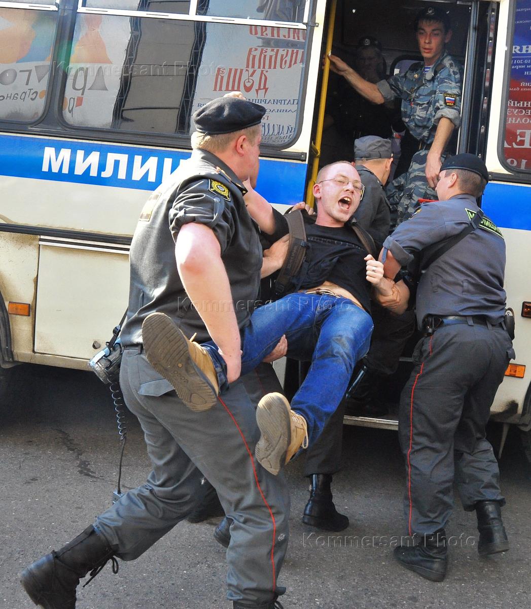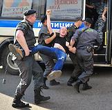 Акция "Марш несогласных" в защиту статьи №31 Конституции России, которая дает гражданам право свободно собираться для выражения своего мнения. Марш, организованный активистами оппозиции и правозащитниками, прошел на Триумфальной площади. Сотрудники правоохранительных органов во время задержания участника акции.