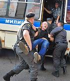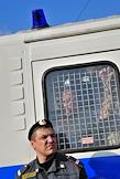 Акция "Марш несогласных" в защиту статьи №31 Конституции России, которая дает гражданам право свободно собираться для выражения своего мнения. Марш, организованный активистами оппозиции и правозащитниками, прошел на Триумфальной площади. Сотрудник правоохранительных органов у милицейского автомобиля с задержанными участниками акции.
