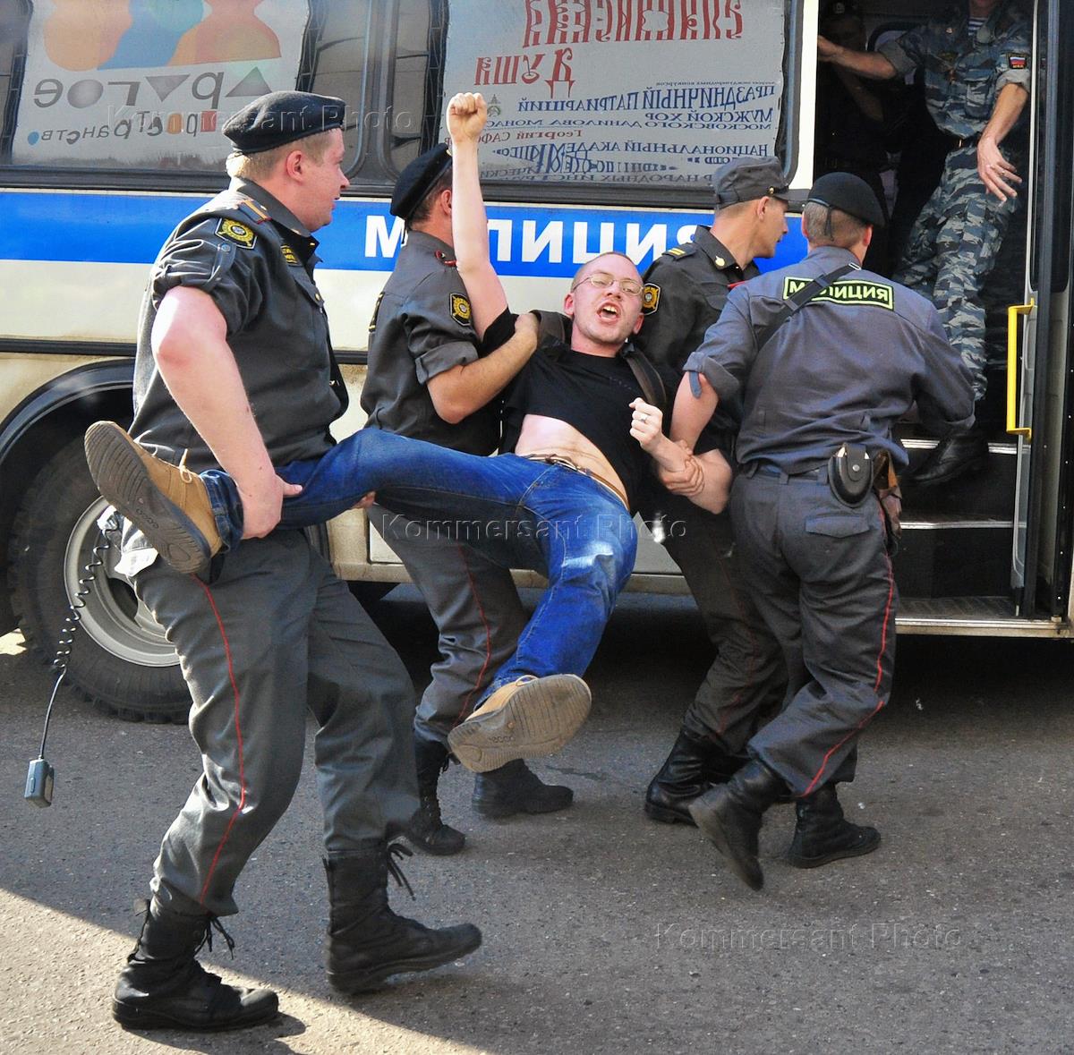 Акция "Марш несогласных" в защиту статьи №31 Конституции России, которая дает гражданам право свободно собираться для выражения своего мнения. Марш, организованный активистами оппозиции и правозащитниками, прошел на Триумфальной площади. Сотрудники правоохранительных органов во время задержания участника акции.