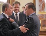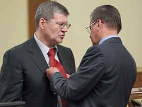 Генеральный прокурор России Юрий Чайка (слева) и первый заместитель председателя правительства России Виктор Зубков (справа) на заседании правительства России.