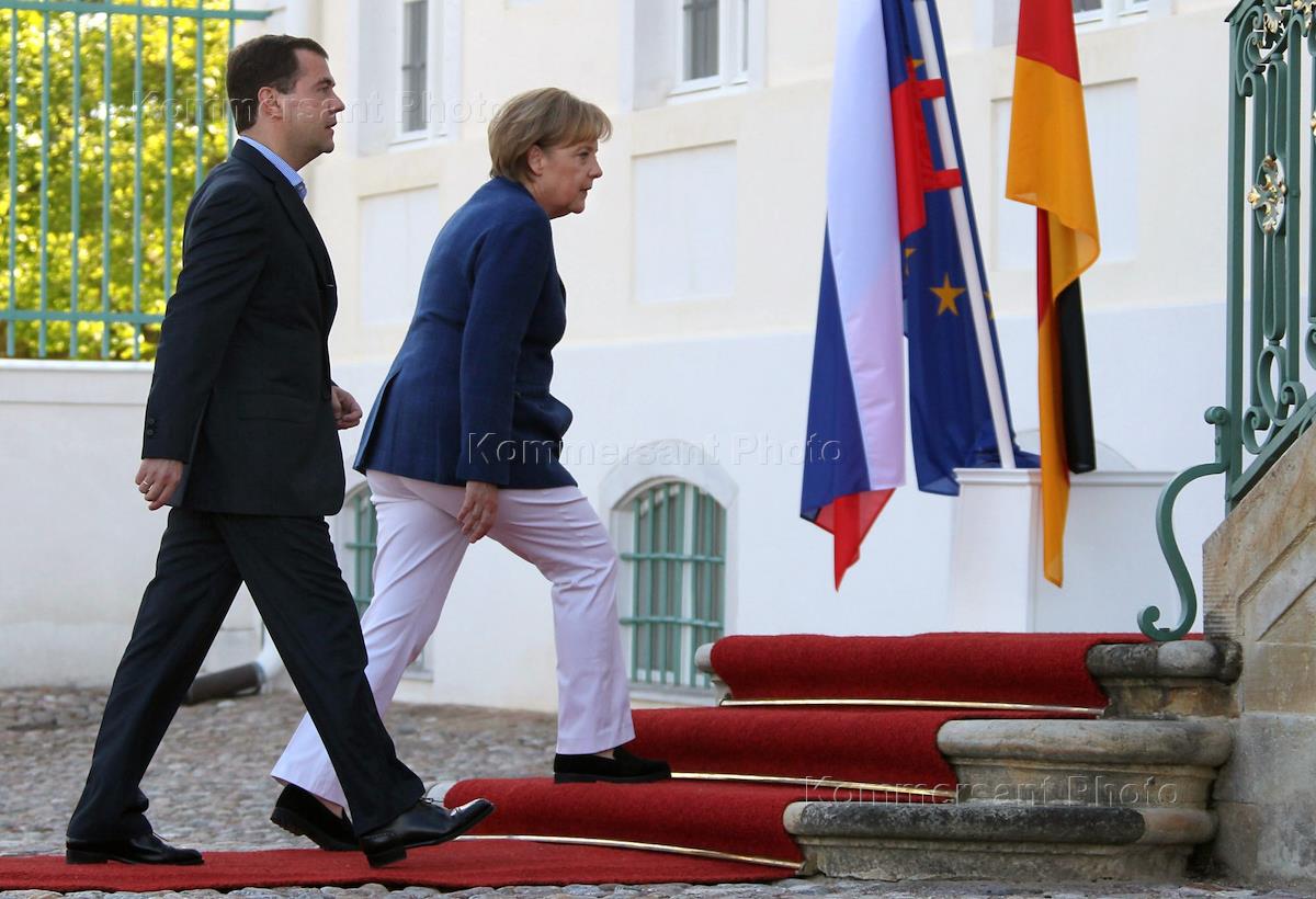 Президент России Дмитрий Медведев (слева) во время прибытия в правительственную резиденцию Германии в замке Мезеберг под Берлином.