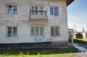 Жанровая фотография. Жилой дом в городе Ош с надписью "кырг дом".