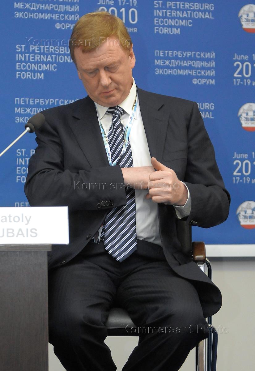 Deputy Director General, European Commission Directorate General for Trade, Peter Balash, Deputy Economic Development Minister of Russia Andrei Slepnev, president and CEO, Siemens AG, Co-Chair of the PCB from the EU, Peter Loescher, CEO of GK "Russian Corporation of Nanotechnologies (Rosnano) Anatoly Chubais, and Carl Bildt, Swedish Foreign Minister during the conference "Russia-EU" in the framework of the Petersburg Economic Forum.