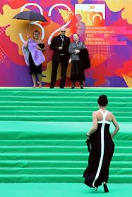 Актриса Ольга Кабо (вторая справа) и председатель союза кинематографистов России, кинорежиссер Никита Михалков (справа) на церемонии открытия XXXII Московского международного кинофестиваля (ММКФ). Церемония прошла в кинотеатре "Пушкинский".
