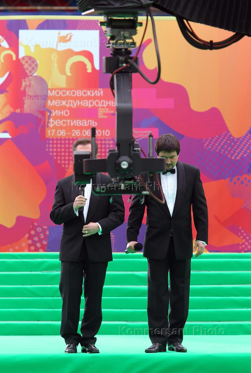 XXXII Московский международный кинофестиваль (ММКФ). Телеведущие Борис Берман (в центре) и Эльдар Жандарев (справа) на церемонии открытия в кинотеатре "Пушкинский".