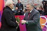 XXXII Московский международный кинофестиваль (ММКФ). Телеведущий Владислав Флярковский (слева) и лидер Либерально-демократической партии России (ЛДПР), заместитель председателя Государственной думы России Владимир Жириновский (справа) на церемонии открытия в кинотеатре "Пушкинский".