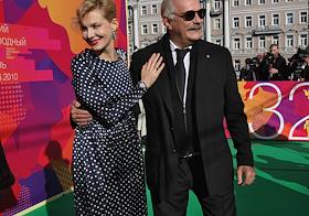 Актриса, сценарист Рената Литвинова (слева) и председатель Союза кинематографистов России, кинорежиссер Никита Михалков (справа) на церемонии открытия XXXII Московского международного кинофестиваля (ММКФ). Церемония прошла в кинотеатре "Пушкинский".
