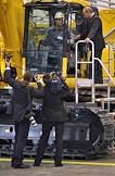 Председатель правительства России Владимир Путин (справа) во время посещения завода по производству строительной техники японской компании "Комацу".