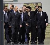 Председатель правительства России Владимир Путин (третий слева) и генеральный директор российского представительства компании "Комацу" Ясухиса Цукамото (второй справа) во время осмотра завода по производству строительной техники "Комацу".