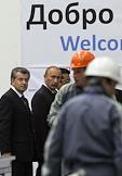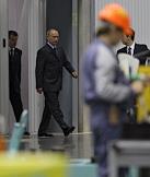 Председатель правительства России Владимир Путин (в центре) и генеральный директор российского представительства компании "Комацу" Ясухиса Цукамото (второй справа) во время осмотра завода по производству строительной техники "Комацу