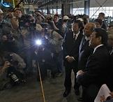 Губернатор Ярославской области Сергей Вахруков (слева) и председатель правительства России Владимир Путин (в центре) во время осмотра завода по производству строительной техники "Комацу".