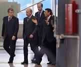 Губернатор Ярославской области Сергей Вахруков (слева), председатель правительства России Владимир Путин (третий слева) и генеральный директор российского представительства компании "Комацу" Ясухиса Цукамото (второй справа) во время осмотра завода по производству строительной техники "Комацу".