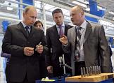 Председатель правительства России Владимир Путин (слева) во время посещения НПО "Сатурн".
