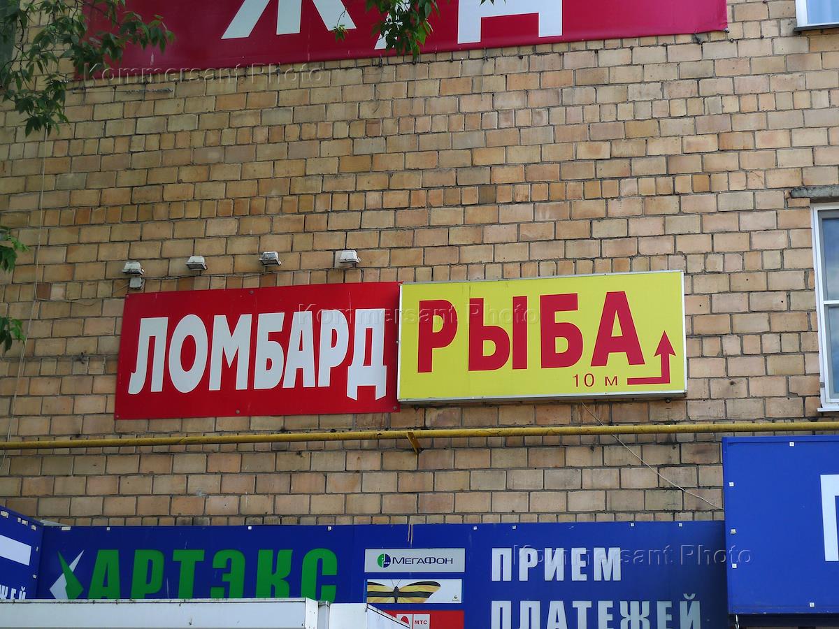 Жанровая фотография. Рекламные вывески на стене дома "Ломбард", "Рыба", "Прием платежей".