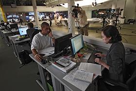 Работа интернет-телеканала "Дождь". Телеведущая Елена Ханга (в центре) студии телеканала.