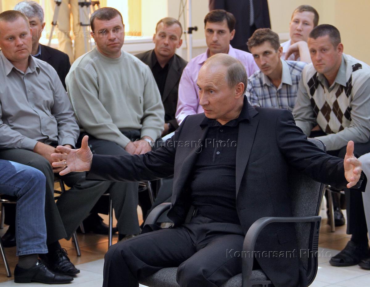 Russian Prime Minister Vladimir Putin (center) at a meeting with families of miners and rescuers who were killed in the Raspadskaya mine.