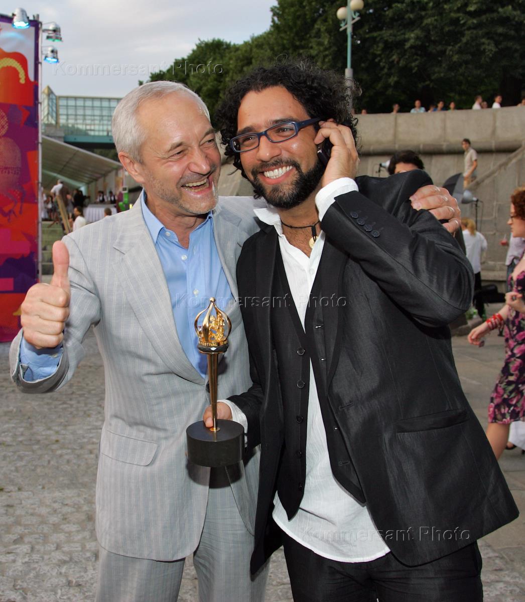 Moscow City Duma member Evgeny Gerasimov (left) and director Marsel Raskin at a reception to mark the closing of the 32nd Moscow International Film Festival in Neskuchny Garden.