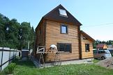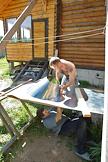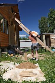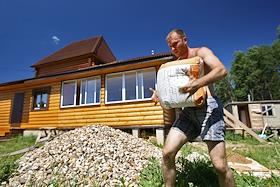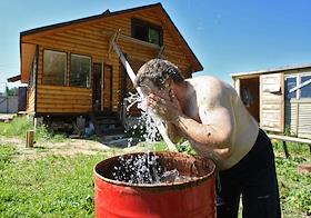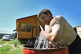 Стройтельство частного загородного дома. Мужчина умывается водой из бочки.