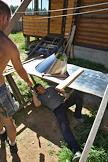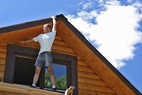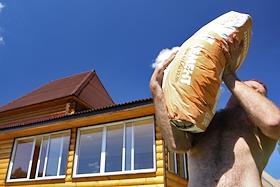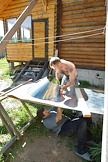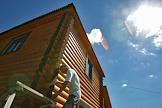 Стройтельство частного загородного дома. Мужчина умывается водой из бочки.