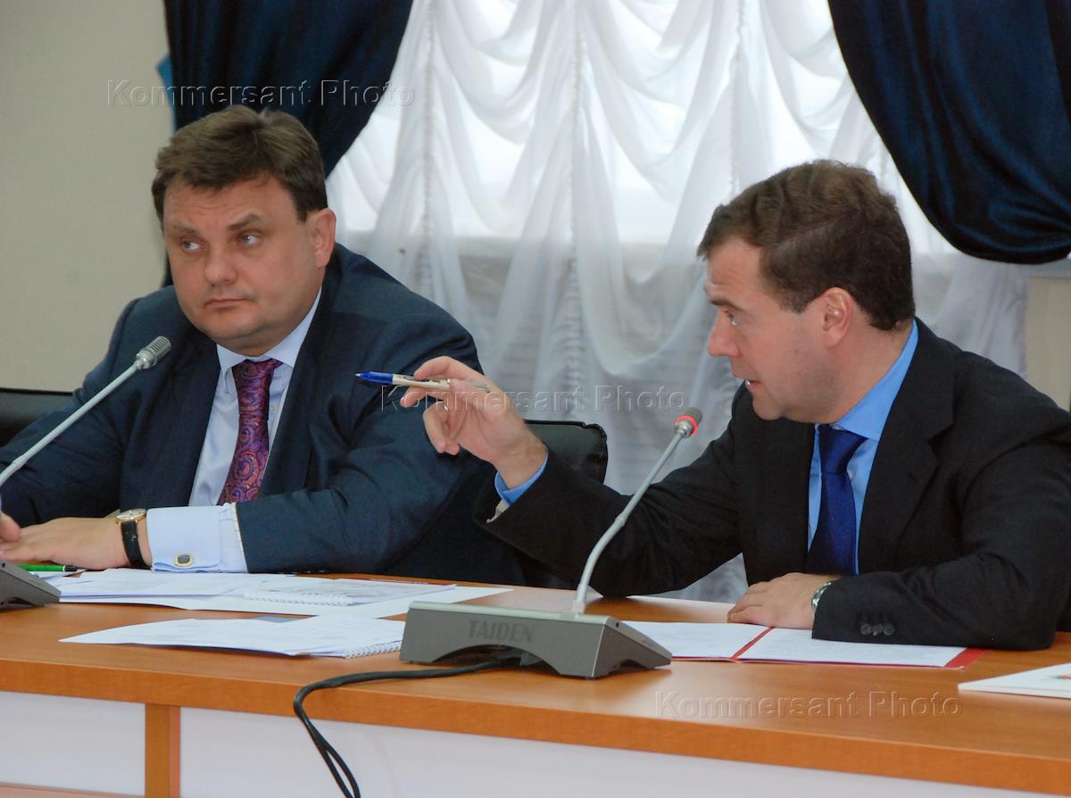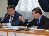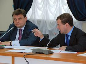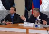 Помощник президента России – начальник контрольного управления президента Константин Чуйченко (слева) и президент России Дмитрий Медведев (справа) на встрече с руководителями муниципальных образований Амурской области.