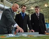 Слева направо: губернатор Амурской области Олег Кожемяко, президент России Дмитрий Медведев и председатель совета директоров ЗАО "УК "Петропавловск" Павел Масловский во время посещения опытно-промышленного завода по определению технологий обогащения и извлечения руд полезных ископаемых, входящего в группу компаний "Петропавловск".