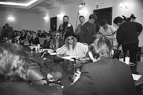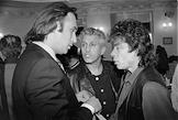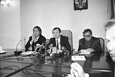 Слева направо: певица Наташа Королева, композитор Игорь Николаев и певица Алла Пугачева во время встречи с руководством налоговой инспекции.
