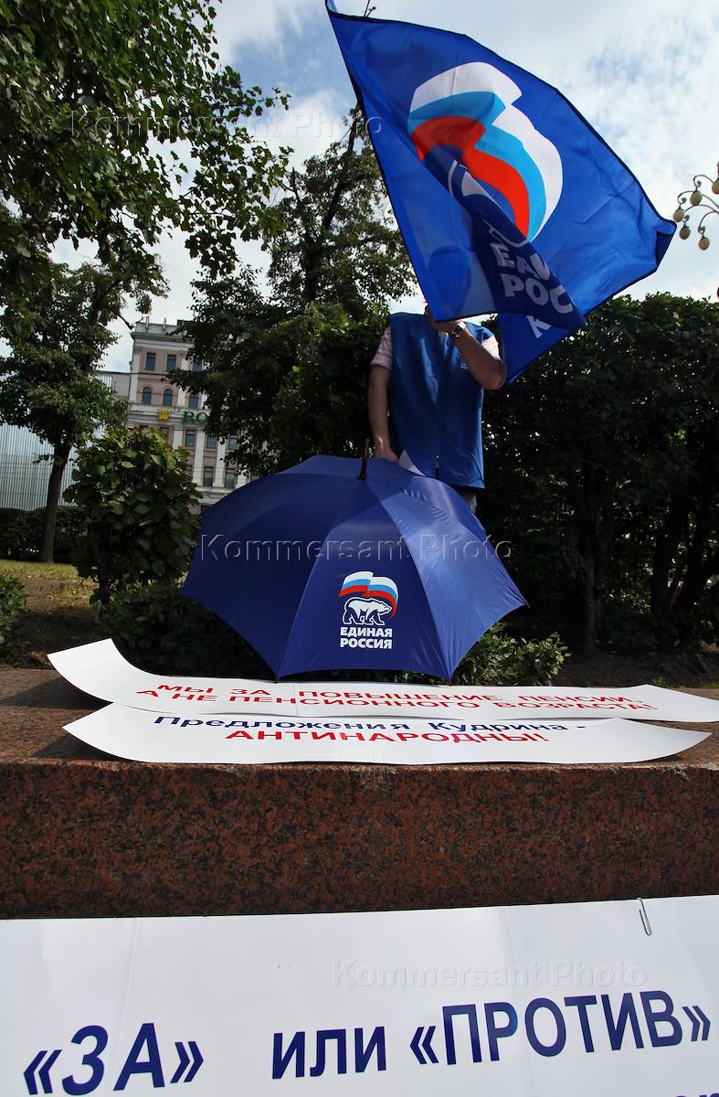 Пикет активистов московскоого отделения партии "Единая Россия" и движения "Молодой гвардии" против повышения пенсионного возраста прошел на Пушкинской площади.
