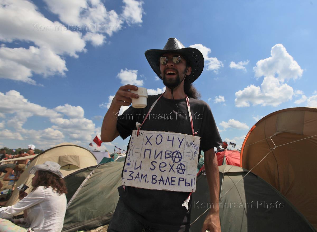 Рок-фестиваль "Нашествие-2010". Зрител на фестивале в поселке Большое Завидово Тверской области. Надпись на плакате "Хочу пива и секса. Зам. Валеры".