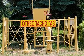 Жанровая фотография. Газовый распределитель с надписью "Огнеопасно - газ" за ограждением.