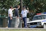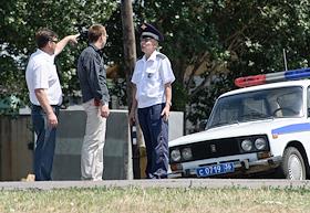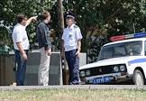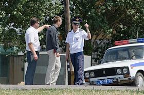 Жанровая фотография. Двое мужчин разговаривают с сотрудником ДПС у патрульного автомобиля.