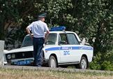 Жанровая фотография. Cотрудник ДПС стоит у патрульного автомобиля.