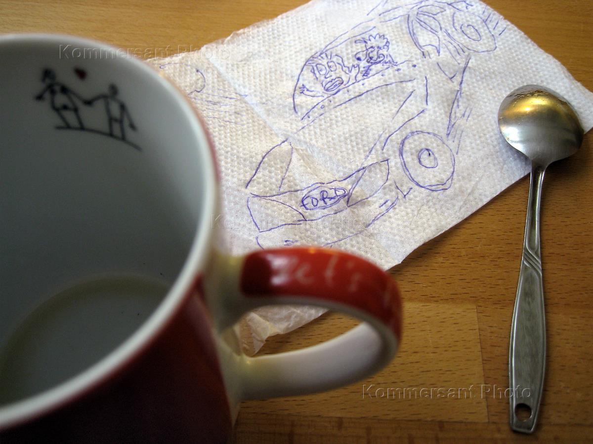 Жанровая фотография. Чайная кружка, чайная ложка и бумажная салфетка с изображением людей в автомобиле на столе.